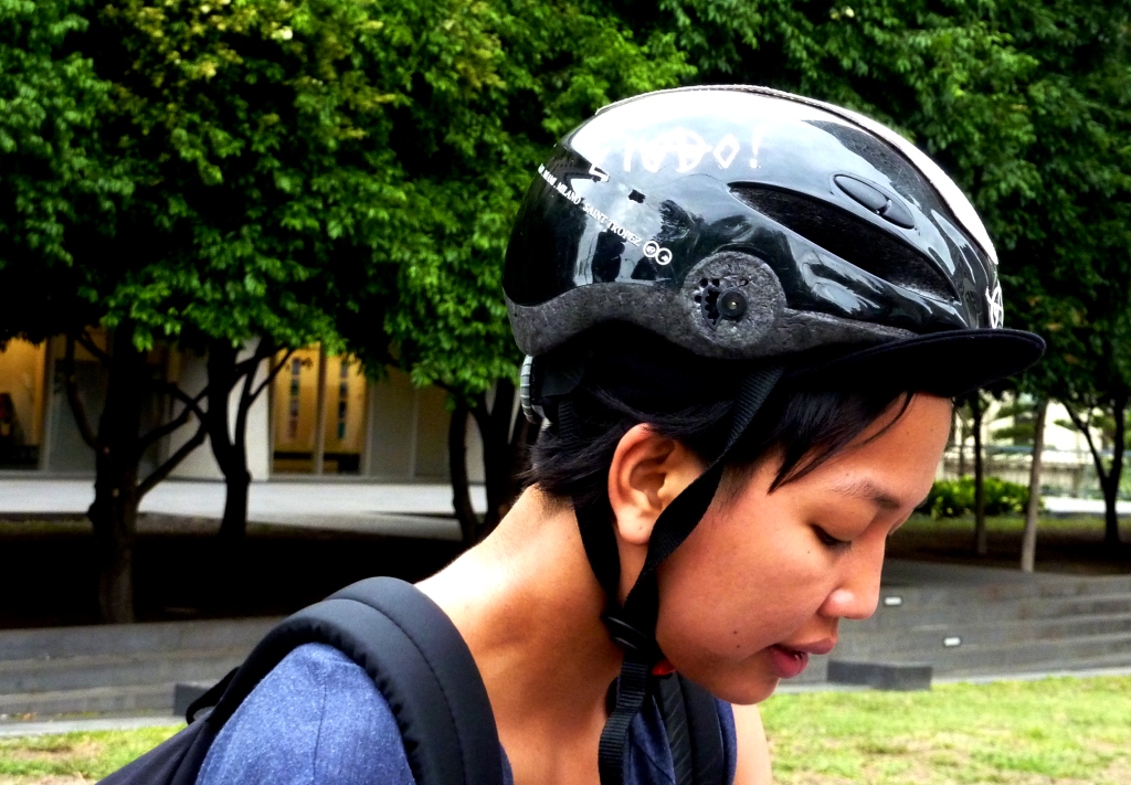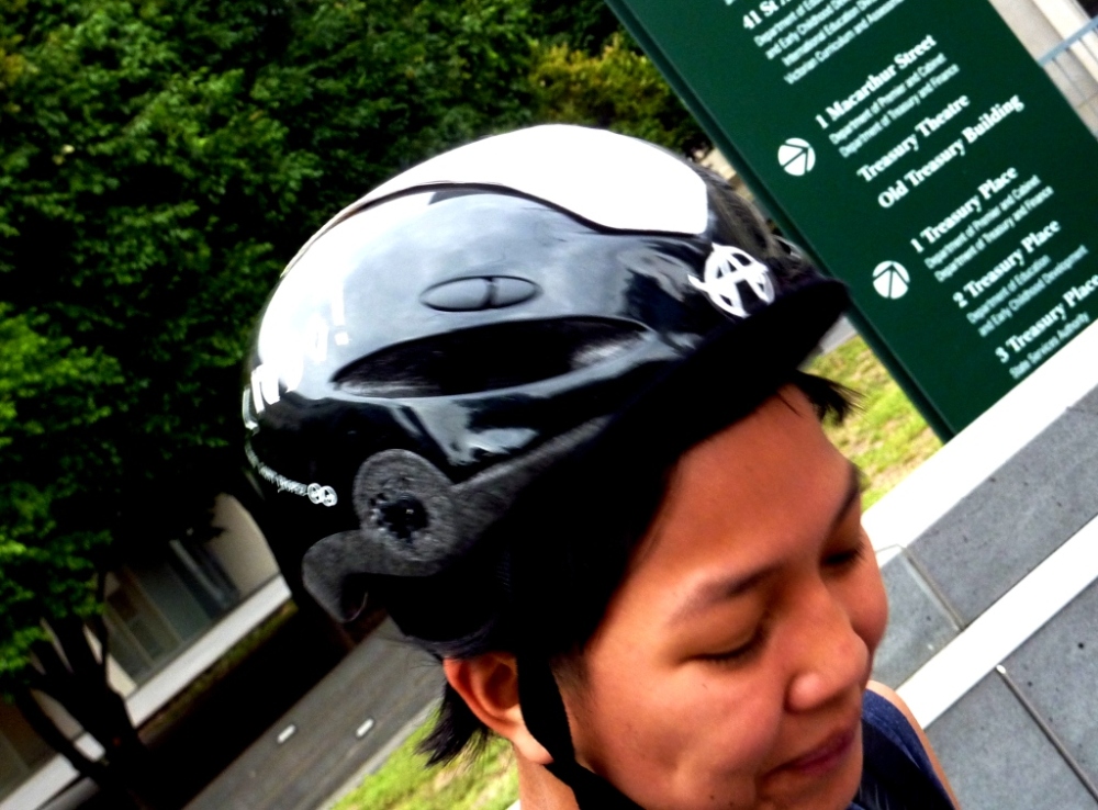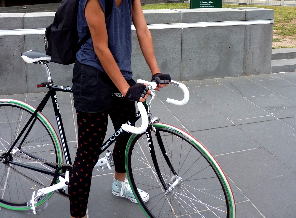 I never saw this piece of 1994 wonderful film. But I did run into a Ms Corrina, somewhere near the Government End of Town recently. Which highlighted one of the great perils of this silly endeavour: scaring your target helmet. Rolling up beside Corrina, I found myself pathetically trying to initiate conversation (along the lines of nice helmet, with cute stickers and it matches your bike and has a leather speed stripe down the top and that’s ace) which unfortunately came across instead like I was trying to rudely pass and cope some sort of attitude. Which is basically what happens whenever my target helmet is riding faster than I am and I’m puffed by the time I catch up. That said, in the end, we pulled over and I avoided endangering either of our lives by trying to make conversation in the middle of morning peak hour commuting. Phew. (And check out the lady guns.)