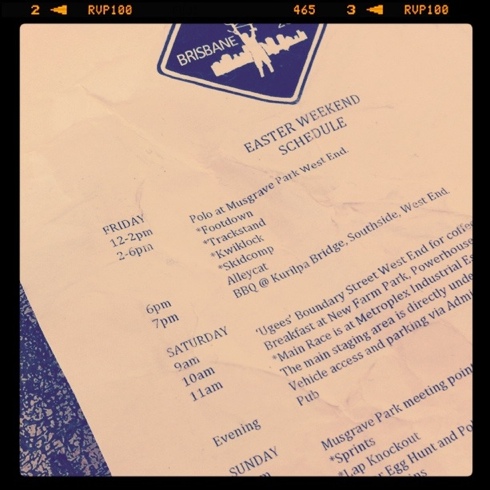 You could be forgiven for thinking I mean the Australian cycle messenger championships. I could – but I don’t. Full props to Gypsy for taking out the title and for all who kindly washed the scabs of the messengers who went down in Saturday’s binfest.
