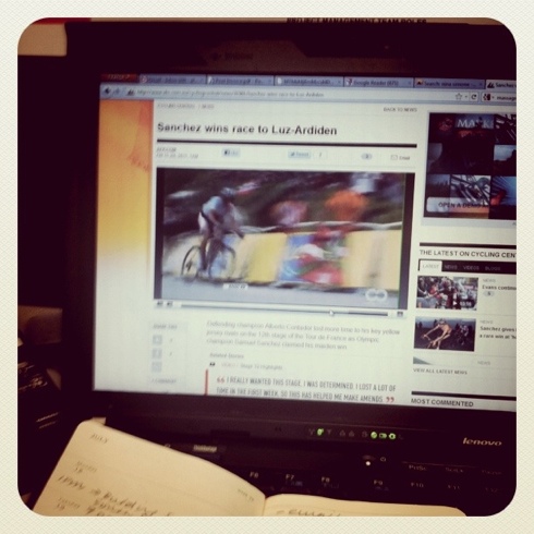 Today all the coverage is about how the Tour started in earnest last night. This is great news, and designed to reassure you, me and everyone else who has reporting issues that they have not missed all that much because tweet tweet Contador is off the pace and hep hep the Schlecks have not been sooo super fascinating and yeah yeah Cavendish has a cute top on and woot woot that’s the sound of the police.