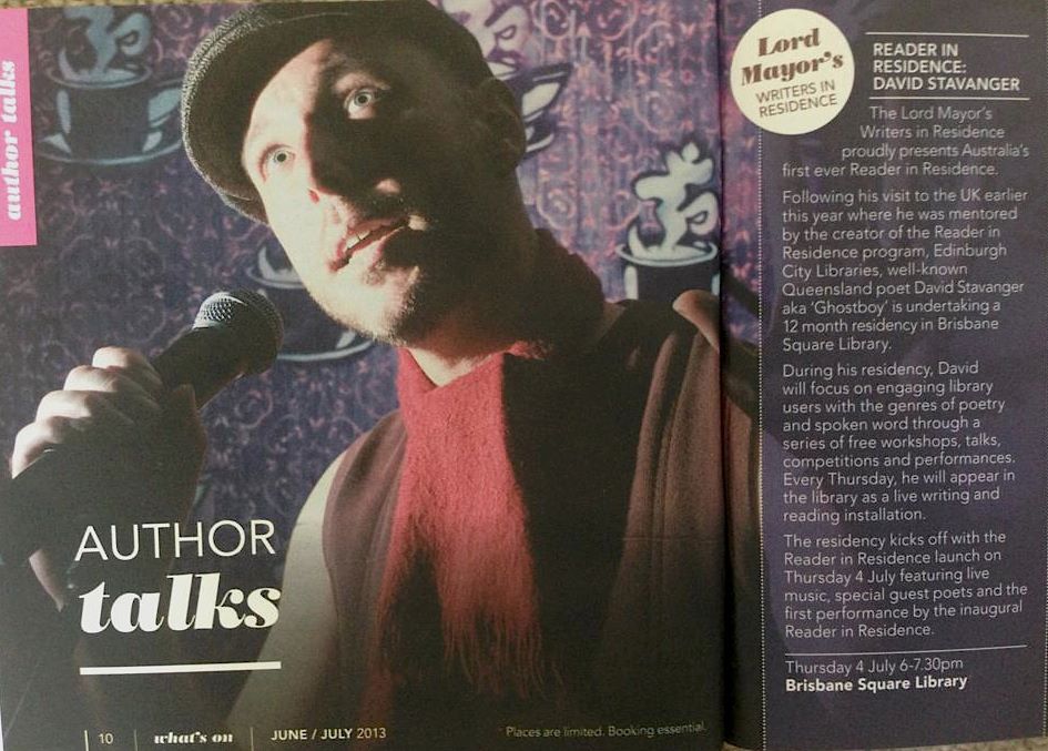 For those who are yet to hear about it, poet, lyricist, and spoken word artist David Stavanger aka Ghostboy will be undertaking a 12 month residency from July 11th at the Brisbane Square Library as the Lord Mayor’s Reader in Residence.